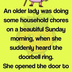 An older lady was doing some household chores on a beautiful Sunday morning, when she suddenly heard the doorbell ring. She opened the door to see a…