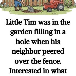 Little Tim was in the garden filling in a hole… … when his neighbor peered over the fence. Interested in what the cheeky-faced youngster was up to,…