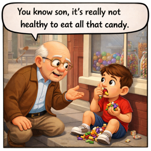 So this old man is walking down the street in Brooklyn: He sees a young boy sitting on the street in front of a candy shop, shoving…