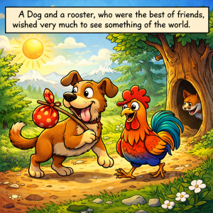 A Dog and a rooster, who were the best of friends, wished very much to see something of the world. So they decided to leave the farmyard…
