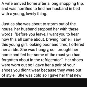 A wife arrived home after a long shopping trip and was horrified to find her husband in bed with a young, lovely thing. Just as she was…