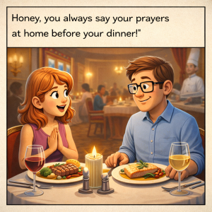 A husband and wife were dining at a 5-star restaurant. When their food arrived, the husband said: “Our food has arrived! Let’s eat!” His wife reminded him:…
