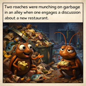 Two roaches were munching on garbage in an alley when one engages a discussion about a new restaurant. “I was in that new restaurant across the street,”…