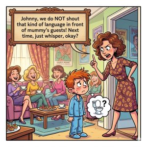 The little Johnny is lying in bed, busting to go to the toilet. So he gets out of bed, runs downstairs into the living room, and finds…