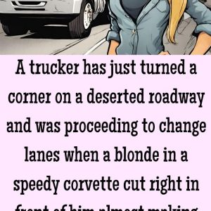 A trucker has just turned a corner on a deserted roadway and was proceeding to change lanes when a blonde in a speedy corvette cut right in…
