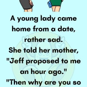 A young lady came home from a date, rather sad. She told her mother, “Jeff proposed to me an hour ago.” “Then why are you so sad?”…