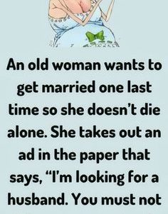A lonely woman, aged 70, decided that it was time to get married. She put an ad in the local paper that read HUSBAND WANTED! MUST BE…