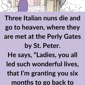 Three Italian nuns die and go to heaven, where they are met at the Perly Gates by St. Peter. He says, “Ladies, you all led such wonderful…