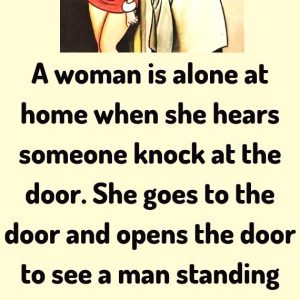 A woman is at home when she hears someone knock at the door. She goes to the door and opens the door to see a man standing…