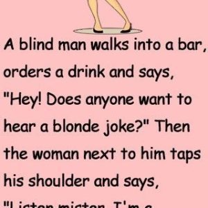 A blind man walks into a bar, orders a drink and says, “Hey! Does anyone want to hear a blonde joke?” Then the woman next to him…