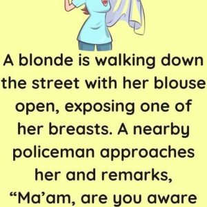 A blonde is walking down the street with her blouse open, exposing one of her breasts. A nearby policeman approaches her and remarks, “Ma’am, are you aware…