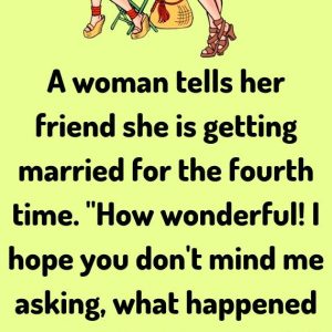 A woman tells her friend she is getting married for the fourth time. “How wonderful! I hope you don’t mind me asking, what happened to your first…