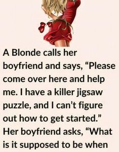 A Blonde calls her boyfriend and says, “Please come over here and help me. I have a killer jigsaw puzzle, and I can’t figure out how to…