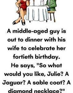 A middle-aged guy is out to dinner with his wife to celebrate her fortieth birthday. He says, “So what would you like, Julie? A Jaguar? A sable…