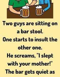 Two guys are sitting on a bar stool. One starts to insult the other one. He screams, “I slept with your mother!” The bar gets quiet as…