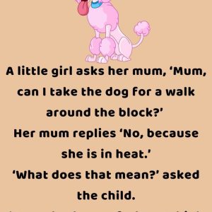A little girl asked her Mom, “Mom, may I take the dog for a walk around the block?” Mom says, “No, because the dog is in heat.”…