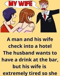A man and his wife check into a hotel. The husband wants to have a drink at the bar, but his wife is extremely tired so she…