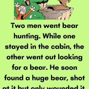 Two men went bear hunting. While one stayed in the cabin, the other went out looking for a bear. He soon found a huge bear, shot at…