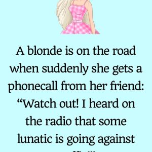A blonde is on the road when suddenly she gets a phone call from her friend: “Watch out! I heard on the radio that some lunatic is…