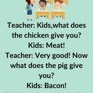 Teacher: Kids, what does the chicken give you? Kids: Meat! Teacher: Very good! Now what does the pig give you? Kids: Bacon! Teacher: Great! And what does…