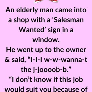 An elderly man came into a shop with a ‘Salesman Wanted’ sign in a window. He went up to the owner & said, “I-I-I w-w-wanna-t the j-joooob-b.”…