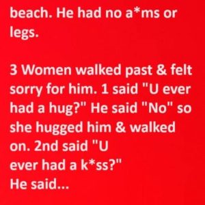 A man sat on a towel on a beach. He had no arms or legs. 3 Women walked past & felt sorry for him. 1 said “U…