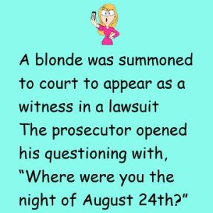 A blonde was summoned to court to appear as a witness in a lawsuit. The prosecutor opened his questioning with, “Where were you the night of August…