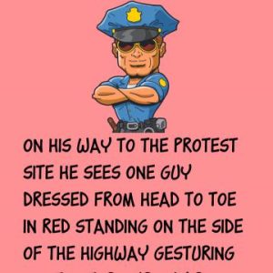 On his way to the protest site he sees one guy dressed from head to toe in red standing on the side of the highway gesturing him…