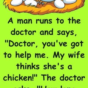 A man runs to the doctor and says, “Doctor, you’ve got to help me. My wife thinks she’s a chicken!” The doctor asks, “How long has she…