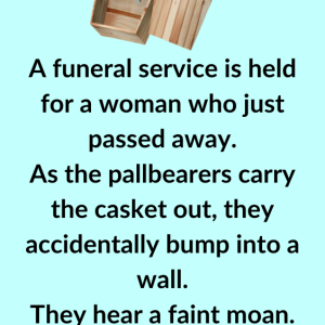 A funeral service is held for a woman who just passed away. As the pallbearers carry the casket out, they accidentally bump into a wall. They hear…