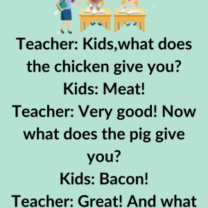 Teacher: Kids, what does the chicken give you? Kids: Meat! Teacher: Very good! Now what does the pig give you? Kids: Bacon! Teacher: Great! And what does…