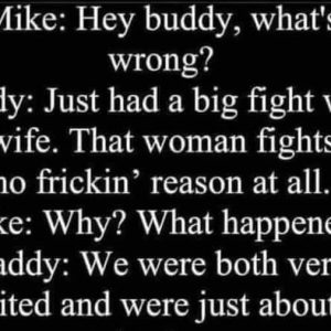 Mike: Hey buddy, what’s wrong? Paddy: Just had a big fight with the wife. That woman fights for no frickin’ reason at all. Mike: Why? What happened?…
