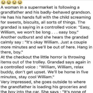 A woman in a supermarket is following a grandfather and his badly behaved grandson. He has his hands full with the child screaming for sweets, biscuits, all…