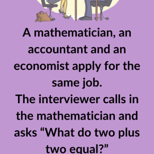 A mathematician, an accountant and an economist apply for the same job. The interviewer calls in the mathematician and asks “What do two plus two equal?” The…