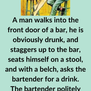 A man walks into the front door of a bar, he is obviously drunk, and staggers up to the bar, seats himself on a stool, and with…