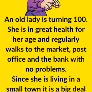 An old lady is turning 100. She is in great health for her age and regularly walks to the market, post office and the bank with no…