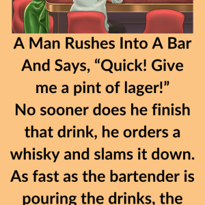 A Man Rushes Into A Bar And Says, “Quick! Give me a pint of lager!” No sooner does he finish that drink, he orders a whisky and…