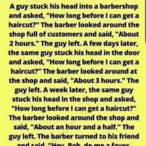 A guy stuck his head into a barbershop and asked, “How long before I can get a haircut?” The barber looked around the shop full of customers…