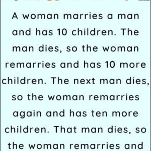 A woman marries a man and has 10 children. The man dies, so the woman remarries and has 10 more children. The next man dies, so the…