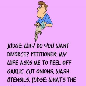 Judge: Why do you want divorce? Petitioner: My wife asks me to peel off garlic, cut onions, wash utensils. Judge: What’s the problem in this? Just warm…