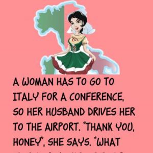 A woman has to go to Italy for a conference, so her husband drives her to the airport. “Thank you, honey”, she says. “What would you like…