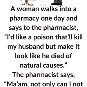 A woman walks into a pharmacy one day and says to the pharmacist, “I’d like a poison that’ll kill my husband but make it look like he…