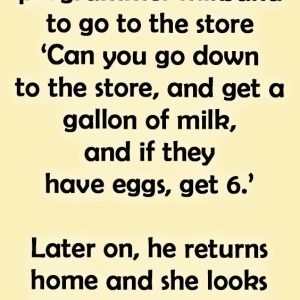 A wife asks her programmer husband to go to the store. ‘Can you go down to the store, and get a gallon of milk, and if they…
