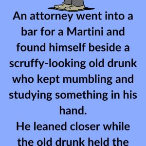 An attorney went into a bar for a Martini and found himself beside a scruffy-looking old drunk who kept mumbling and studying something in his hand. He…