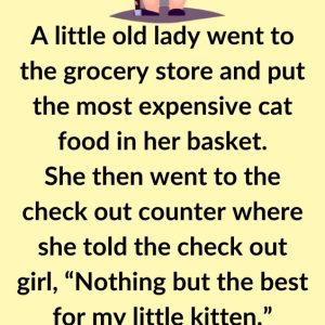 A little old lady went to the grocery store and put the most expensive cat food in her basket. She then went to the check out counter…