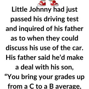 Little Johnny had just passed his driving test and asked his father when they could discuss his use of the car. His father said he’d make a…