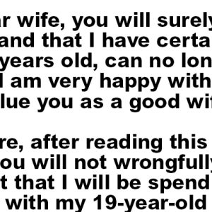 “My dear wife, you will surely understand that I have certain needs you, 57 years old, can no longer satisfy. I am very happy with you, and…