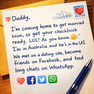 Daughter’s text to Dad: Daddy, I’m coming home to get married soon, so get your checkbook ready. LOL! As you know, I’m in Australia and he’s in…