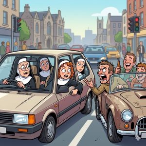 A car full of Irish nuns sitting at a traffic light in downtown Dublin, when a bunch of rowdy drunks pull up along side of them. “Hey,…
