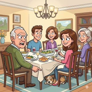 A woman goes to her boyfriend’s parents’ house for dinner. This is tobe her first time meeting the family and she is very nervous. They all sit…